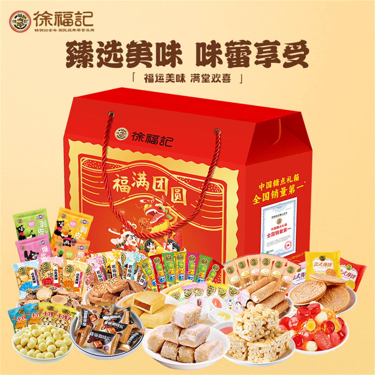 福滿團圓 發布時間:2025-01-04點擊:37 團購優惠請聯系我們 內容物:1:徐福記酥心糖150克*2袋2:徐福記沙琪瑪418克3:徐福記新年什錦糖120克*2袋4:100%果汁軟糖120克*2袋5:米格瑪110克*2袋6:徐福記鳳梨酥200克7:雀巢咖啡樂(罐裝)92g8:徐福記棉花糖242克9:徐福記綜合餅點200克*2袋(小丸煎餅、巖板燒、京屋果子、卷心酥、法式薄餅等) 請填寫您的信息 提交留言